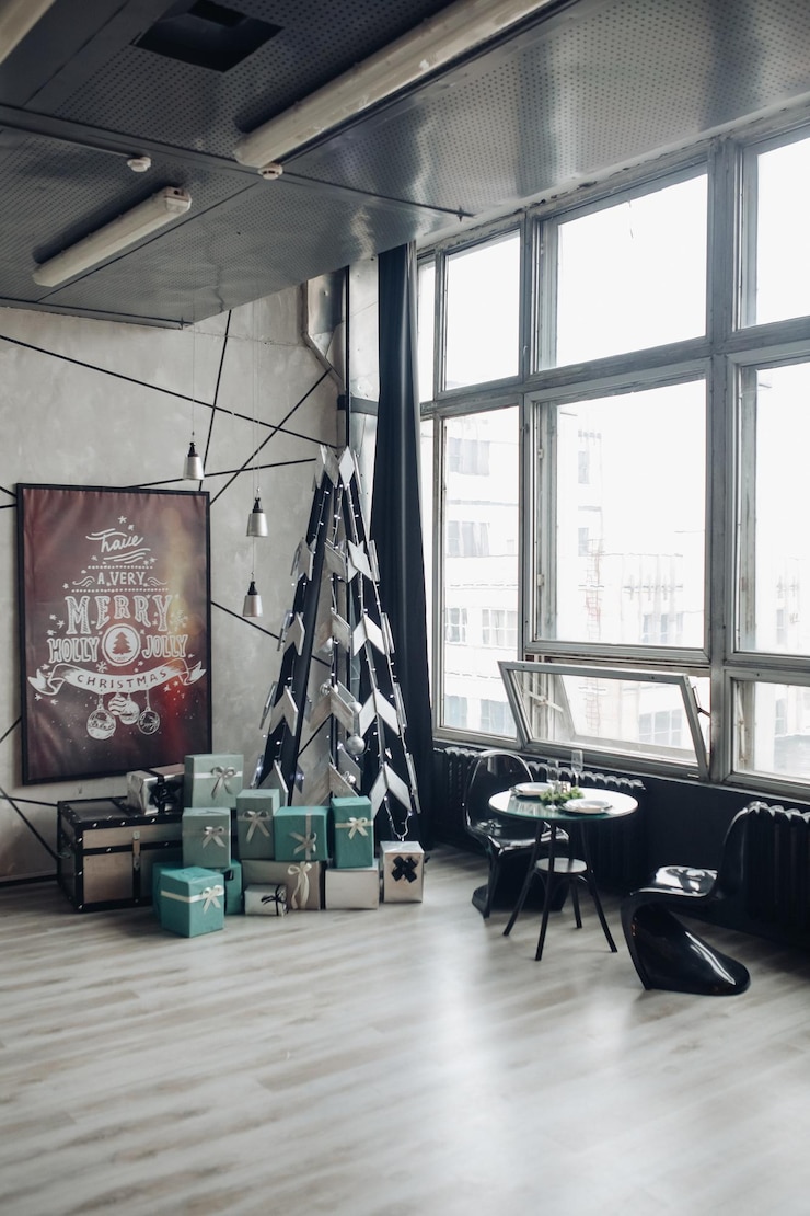 В гостиной находится диван бирюзового оттенка, который можно разложить и использовать в качестве спального места. Обеденный стол также имеет трансформирующуюся конструкцию, что позволяет разместить большое количество гостей и близких. Длинный пуф с полкой служит журнальным столиком: на него удобно положить ноги после утомительного дня, а на нижней полке можно хранить настольные игры или книги. В квартире предусмотрена отдельная гардеробная, вход в которую закрыт шторой — был выбран материал с «театральной» черно-белой полоской.