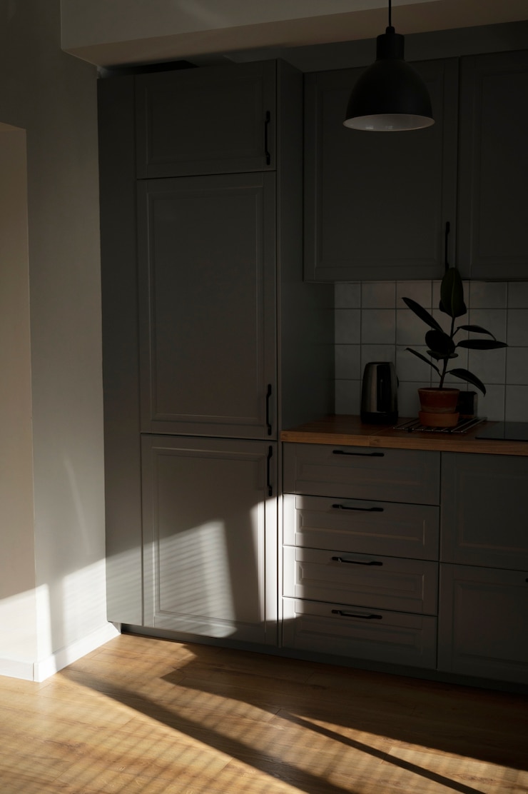 Большую часть систем хранения поместили слева от кухни, чтобы её не было видно из гостиной.
