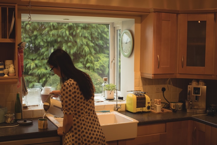 Проект кухонного гарнитура был разработан с максимальной внимательностью к деталям. По словам Алены, слева, за нижней панелью, находится стиральная машина. Над ней расположены удобные выдвижные секции для хранения продуктов и рассыпчатых ингредиентов. За ними следует духовой шкаф, совмещенный с независимой электрической плитой.»