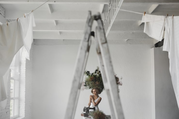 В проходном коридоре расположена вместительная гардеробная со стеклянными дверями из темного стекла, обеспечивающими обзор содержимого. Там же хранятся швейные принадлежности: машинка, оверлок и гладильная доска. В нишах вдоль стены установлены небольшие встроенные светильники, создающие комфортное освещение в вечернее время.