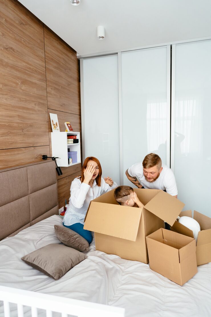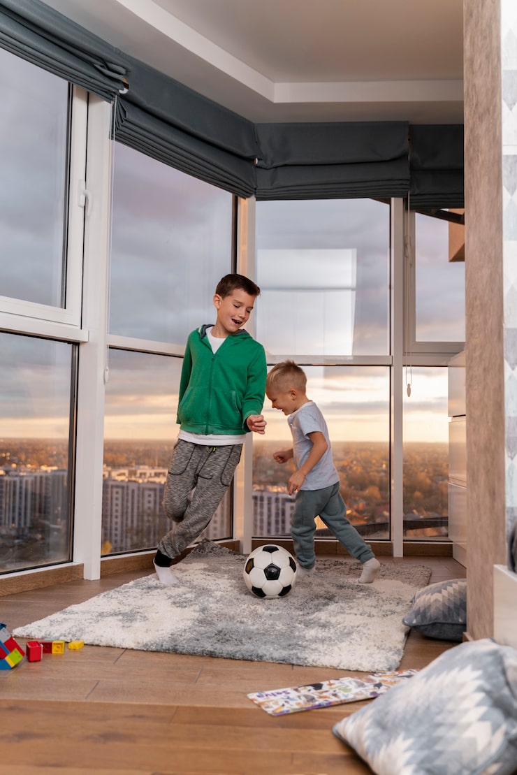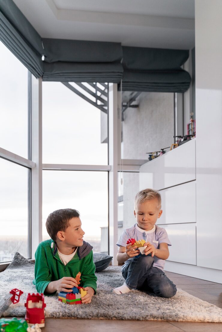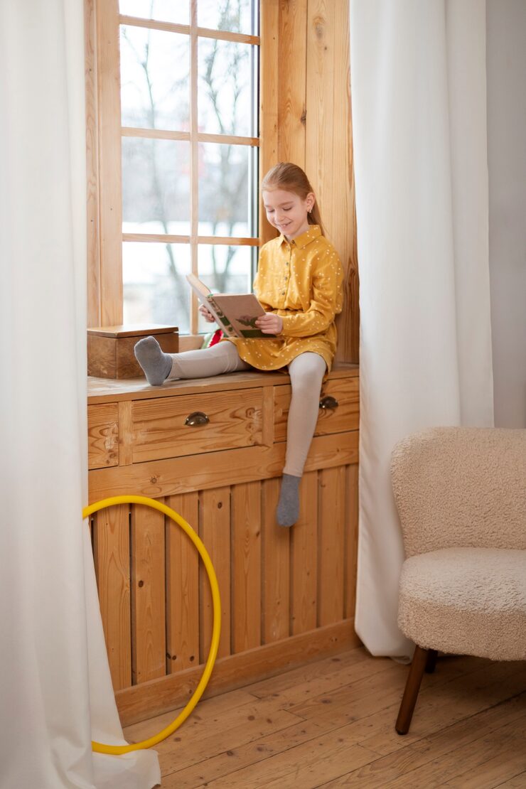 В обеих детских комнатах стены с окном и подоконники отделаны шпоном. Глубина подоконников была продумана для удобного сидения с подушками. В комнате мальчика был создан домик из шпона, в который встроена кровать и шкаф для хранения вещей и игрушек.