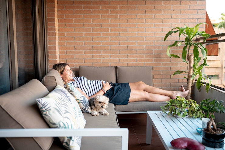 Помимо этого, гостиная имеет выход на лоджию – просторную и хорошо освещенную комнату. В ней расположились небольшой диван с белой обивкой и старинная мебель в стиле ретро, включающая устойчивый табурет, подставку и небольшой складной столик. Пол в комнате покрыт теплым ковром, напоминающим мягкую траву. В помещении также размещено несколько горшков с живыми растениями.