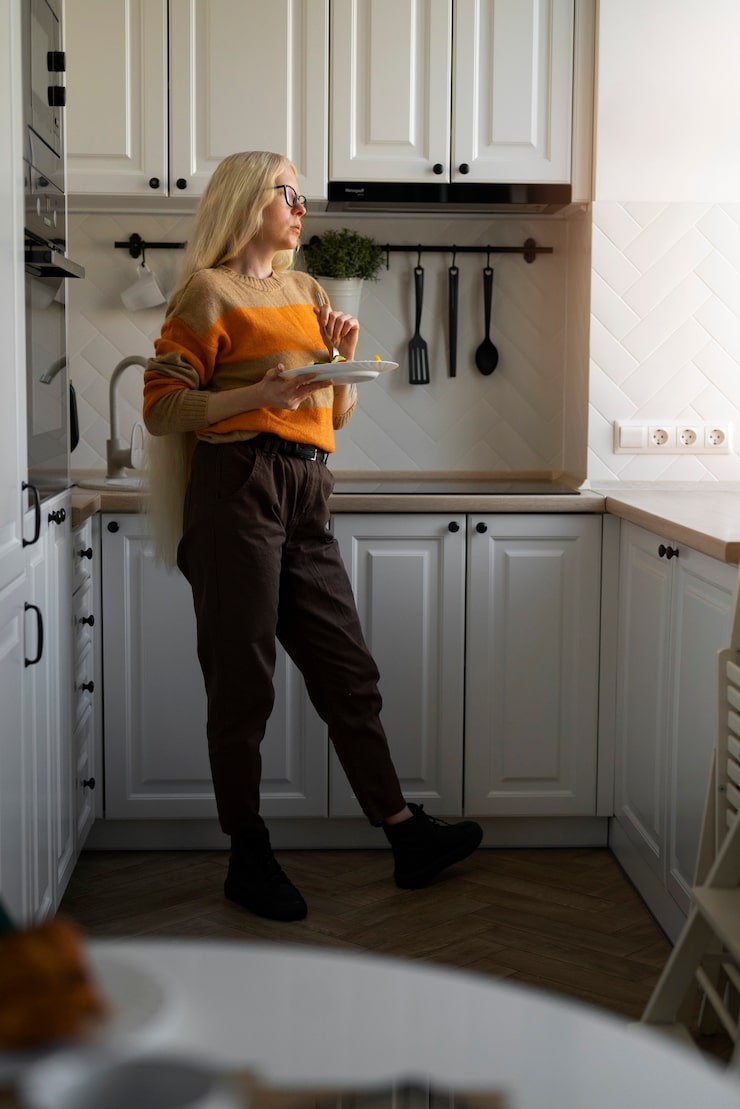 Кухня полностью укомплектована всем необходимым оборудованием: микроволновая печь, посудомоечная машина, духовой шкаф и варочная панель — все это сделано с акцентом на удобство и практичность. Также предусмотрено место для стремянки, что добавляет удобства в использовании пространства.