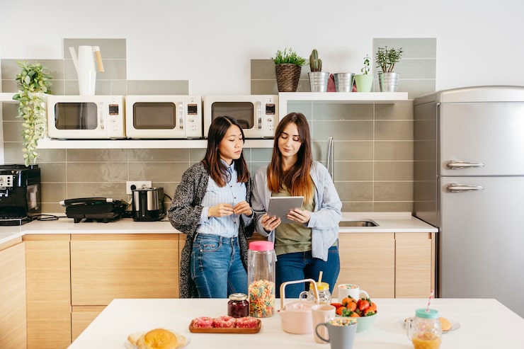 Кухню выделяет яркая оранжевая плитка. Стоит отметить оригинальную планировку — она выглядит очень эффектно.