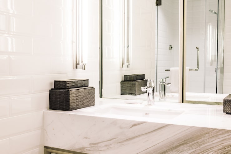В ванной комнате предусмотрено два варианта освещения: можно активировать основной свет, два подвесных светильника или их комбинацию. Кроме того, зеркало оснащено дополнительной подсветкой.