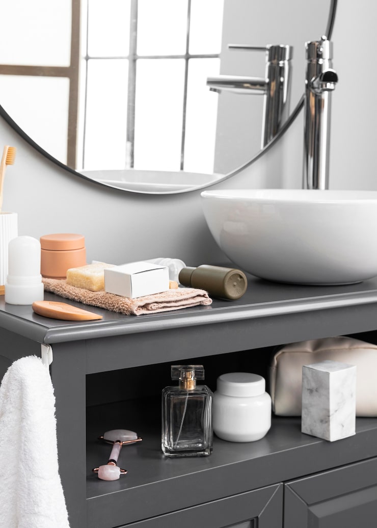 Предусмотрены две ниши для хранения. Одна расположена в душевой, с полками, облицованными керамогранитом – для размещения банных принадлежностей. Вторая – возле раковины, изготовлена из мебельного щита, обработанного воском и водоотталкивающей пропиткой для защиты древесины от воздействия влаги.