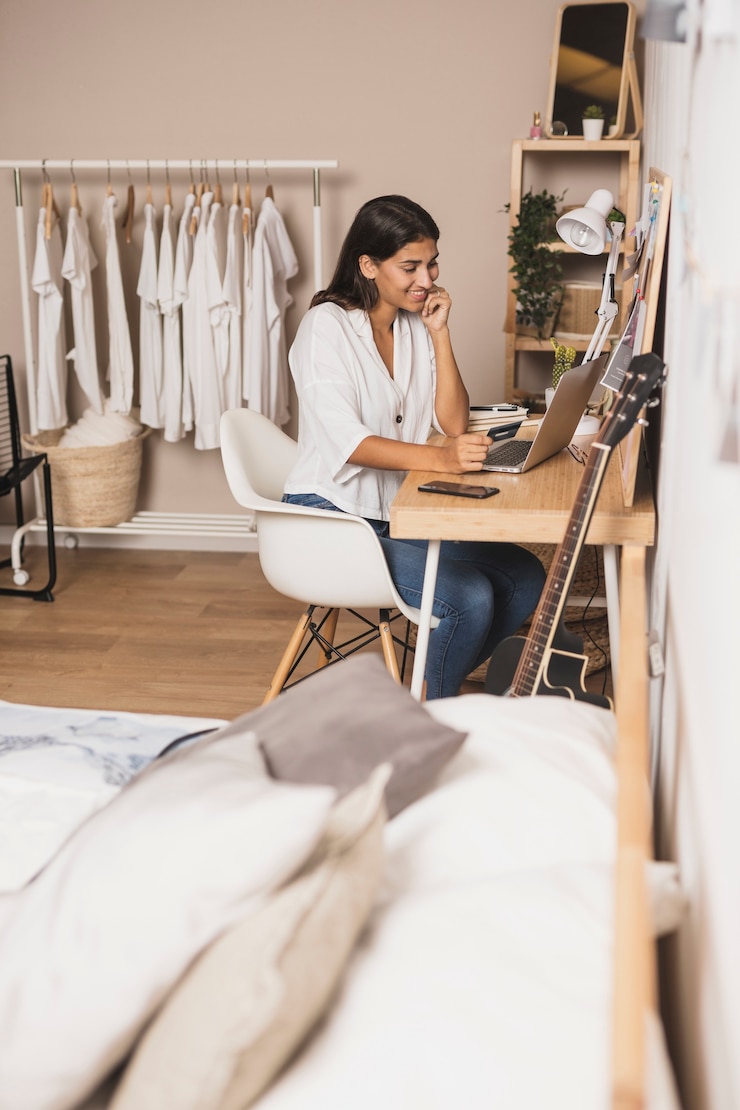 В спальне, помимо основного бежевого цвета на стенах, одна стена была окрашена в нежный бирюзовый оттенок, а рабочая зона выделена декоративным панно. Панно было создано по индивидуальному заказу: дизайнеры определили изображение с абстрактным мотивом, подрядчик разработал макет и выполнил пробную печать на выбранном материале. Благодаря цветовой пробе удалось подобрать нужный оттенок краски.