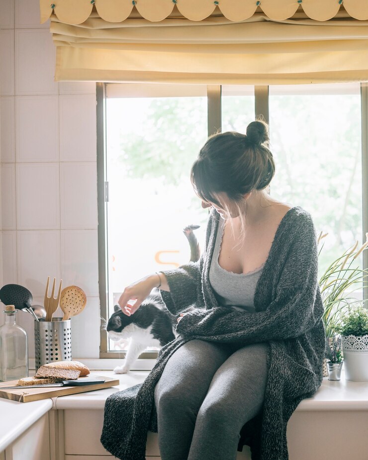 Изначально квартира имела стандартную планировку, включавшую кухню и жилую комнату. Для повышения удобства была произведена перепланировка: обустроили отдельную просторную гардеробную, скрытую за зеркальной раздвижной дверью. Кухню, предусмотренную проектом застройщика, объединили в пространство, совмещающее функции кухни, столовой и гостиной. Небольшой диван для посетителей дополняет компактный кухонный гарнитур. На противоположной стене разместили телевизор, а в центре комнаты организовали обеденную зону. Выход из кухни ведет на лоджию, где создали зону отдыха с рабочей поверхностью, простирающейся вдоль окна.