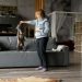 Ярко-желтый диван стал ключевым акцентом в оформлении гостиной. Полосы на плакате, расположенном над диваном, торшер с изящной ножкой и полоски на ковре из искусственного меха сформировали выразительный ритмический узор, который определил стиль интерьера.