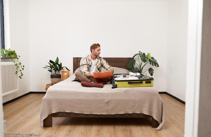 В кладовке, расположенной напротив входа в квартиру, находится гардеробная комната и вместительные шкафы для хранения вещей. Это позволило создать замечательную квартиру-студию, которая станет отличным вариантом для одинокого человека или молодой пары.