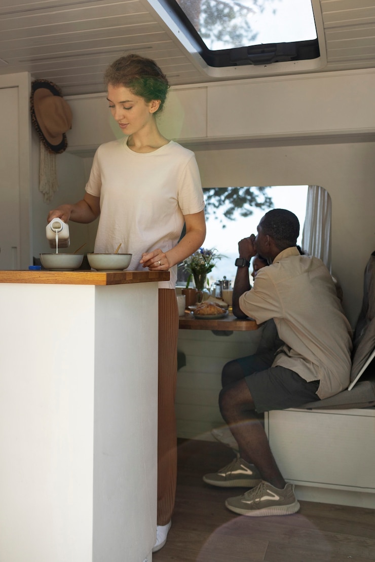 Большинство систем хранения создавали своими руками: это и традиционные шкафы, и ниши в скосах крыши. Также использовали цоколь кухонного гарнитура с выдвижными ящиками. Дизайнер говорит, что гости часто удивляются, как на такой площади всё могло разместиться.