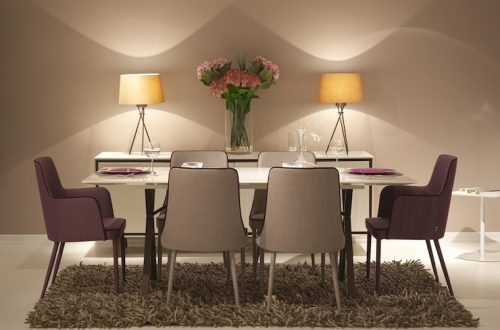 Столовая с выразительным, запоминающимся дизайном расположена в гостиной у соседей. В отделке стен комнаты, предназначенной для еды, сочетаются белый и сине-голубой цвета. На этом фоне эффектно выделяется необычная обеденная группа, включающая круглый стол с небесно-голубой столешницей и удобные пластиковые стулья-кресла различных цветов. Завершает необычный образ столовой зоны столь же оригинальная люстра, разработанная известным дизайнером и состоящая из множества записок с самым разным содержанием.
