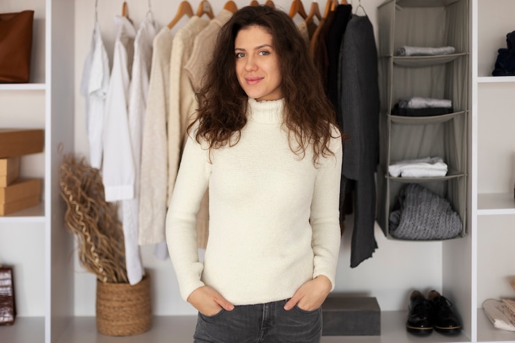 Гардеробная отделана яркими обоями с рисунком. Вместительный шкаф был изготовлен по индивидуальному заказу. В нем предусмотрены выдвижные ящики, рейлы, полки, корзины и отдельный шкафчик для хозяйственных принадлежностей. Напротив двери располагается ящик для украшений со встроенным зеркалом. Под ним стена отделана черной экокожей, которая визуально напоминает каскад, создавая эстетичный вид.
