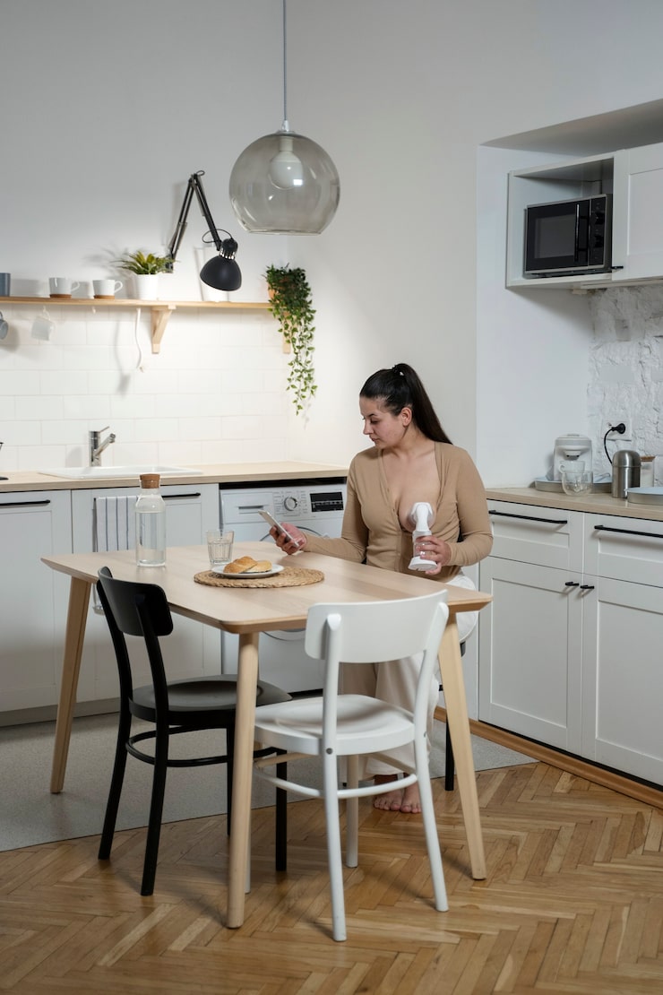 К основным предметам мебели относятся обеденный стол и стулья с мягкой обивкой. Освещение обеспечивается подсветкой гарнитура и светильником над обеденным столом, выполненным с плетеным абажуром; такой рассеянный свет создает теплую и уютную обстановку.