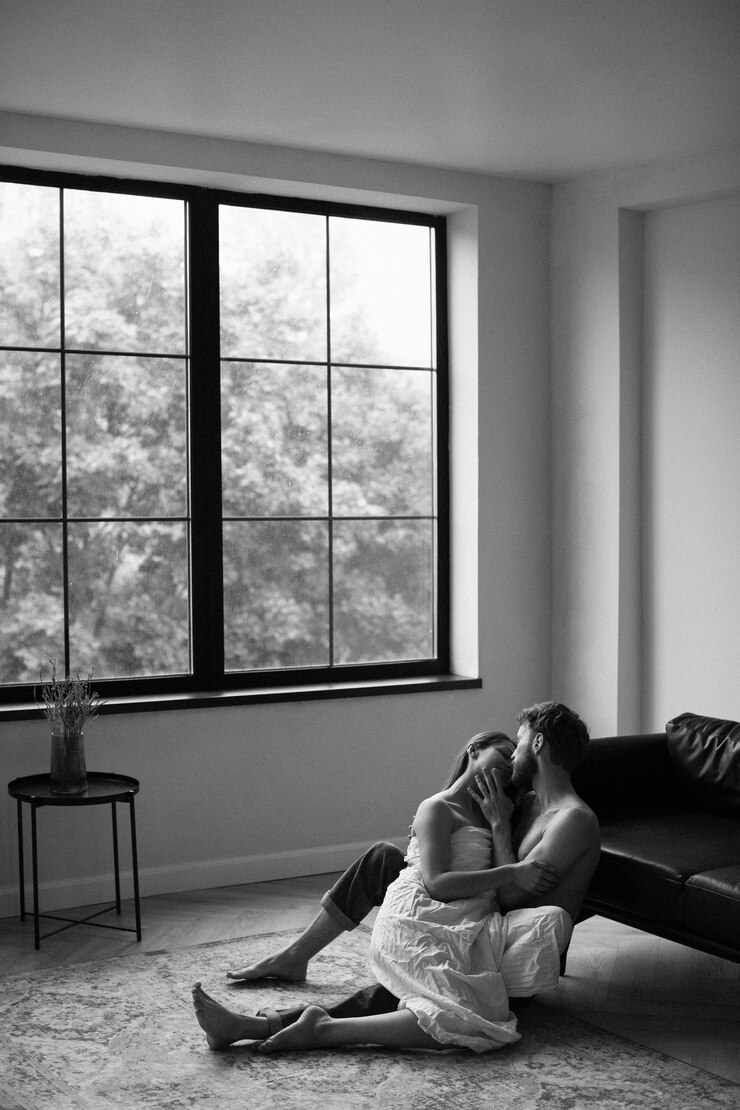 В качестве основы для оформления интерьера квартиры выбран контраст между светлыми и тёмными тонами серого цвета.