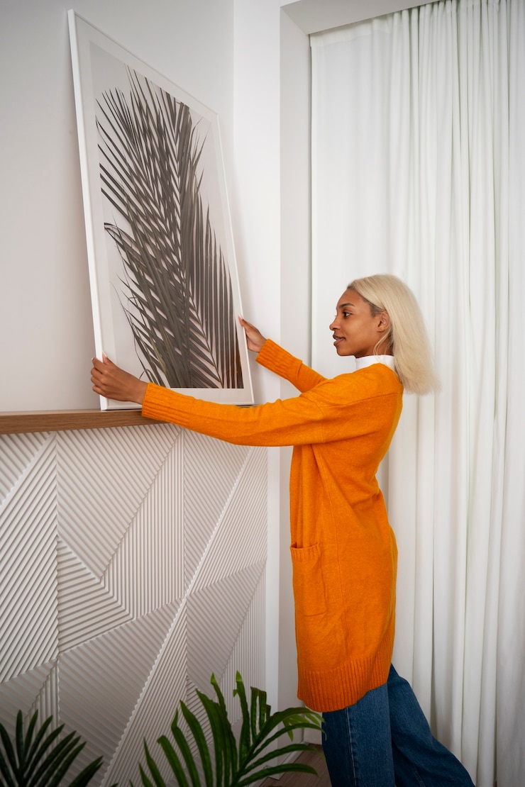 Декоративное панно из кругов над диваном стало интересным акцентом интерьера. Хозяйка квартиры нашла человека, продававшего обрезки фанеры круглой формы, через объявление на Авито. Из оставшейся краски она создала узоры с переплетением всех цветов квартиры. По инструкции дизайнера хозяйка реализовала этот креативный проект самостоятельно.