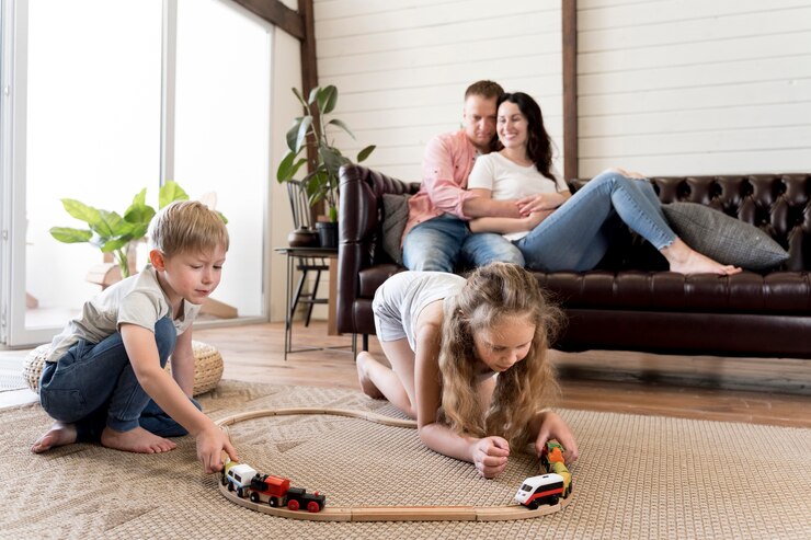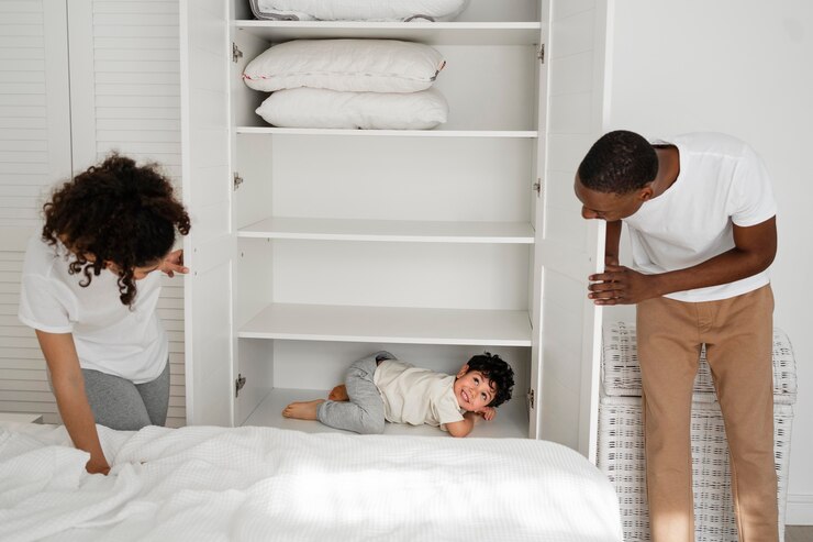 Для детской комнаты наилучшим выбором оказалась двухъярусная кровать. По запросу заказчиков при входе в комнату установлен спортивный уголок. Чтобы в центре помещения осталось место для игр, вся мебель была расположена вдоль стен.