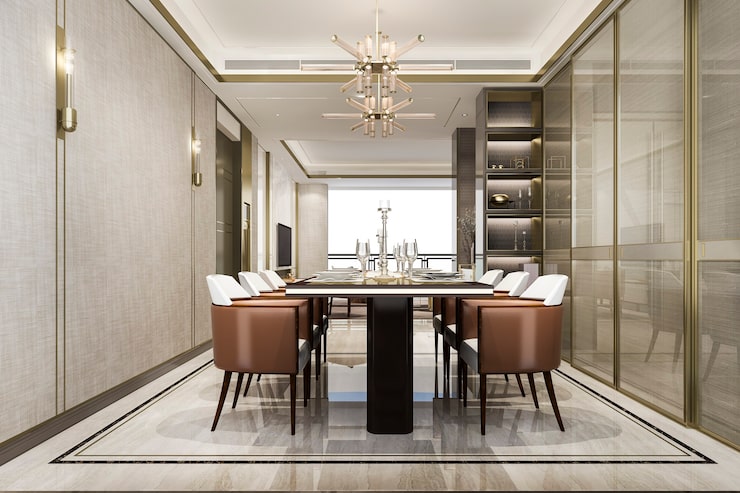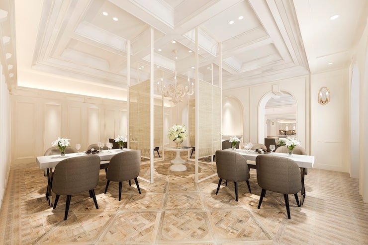 Первоначально заказчица настаивала на исключительно белом интерьере в стиле французской классики, не желая включать цветные акценты, кроме подушек. Но впоследствии проект претерпел изменения, и она дала согласие на использование цвета: были выбраны серые кресла и красочные ковры, приобретенные ею во время поездки в Турцию.