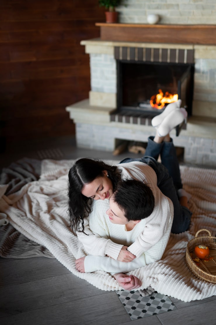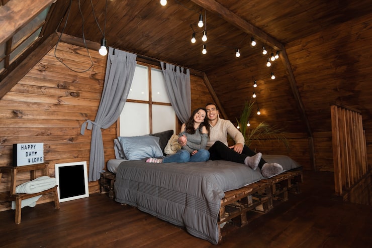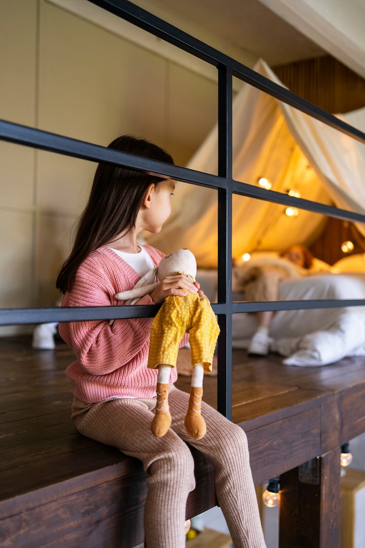 Спальня выполнена в глубоких синих тонах, которые повторяются в настенной росписи с цветами и текстильных изделиях. Встроенный шкаф визуально сочетается со стеной, не создавая ощущения перегруженности. Это решение позволяет оптимально использовать доступную площадь, сохраняя лаконичность форм и минималистичный дизайн. Приглушенный свет завершает композицию, формируя комфортную и сбалансированную атмосферу.