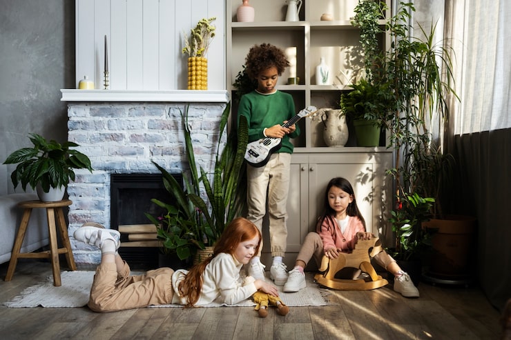 Изначальный дизайн помещений не был изменен. В доме предусмотрен один этаж, где находятся кухня, объединенная с гостиной, спальня для родителей, детская комната, гостевая комната, которая также может использоваться как кабинет, два санузла и помещение, совмещающее котельную и постирочную.