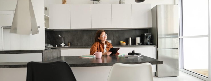 В семье, где готовят мало, можно использовать компактный линейный гарнитур с варочной панелью из двух конфорок и узкой посудомоечной машиной шириной 45 сантиметров. Лучше всего при минимальной длине гарнитура использовать всю высоту стены, а верхние шкафы сделать до потолка. Такая планировка позволит разместить полноценный обеденный стол для четырех человек.