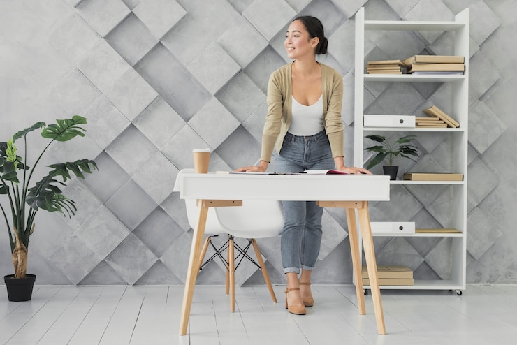 После возведения перегородок площадь студии составляет 24 квадратных метра, из них 15 метров — жилая зона. Квартира выполнена в современном стиле. Акцент — на стене, выложенной декоративным кирпичом, а также цветовые акценты на стенах терракотового цвета.