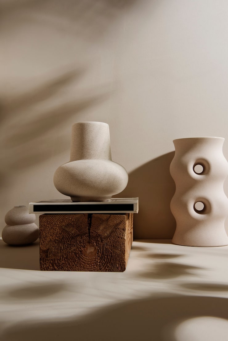 - Материалы: натуральные, с текстурой. Дерево с видимой структурой, а не идеально гладкое. Льняной текстиль, а не синтетика. Керамика ручной работы, а не стекло и пластик. Камень, ротанг, шерсть.
