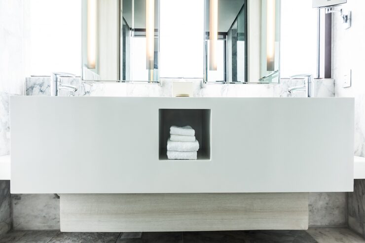 Что делать: если ремонт уже сделан, ниши не встроить. Но можно добавить закрытые системы хранения. Узкий пенал в углу, подвесная тумба под раковину вместо накладной, угловые полки из стекла или нержавейки — это лучше, чем ничего.
