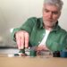 Сантехника также заслуживает особого внимания, поскольку вся фурнитура выполнена в латунном цвете. Смесители, душевые системы и даже держатель для туалетной бумаги гармонируют с золотистыми деталями в светильниках. Круглое зеркало, выполненное в тон латунным элементам, дополняет интерьер, смягчая строгие линии плитки и мебели.