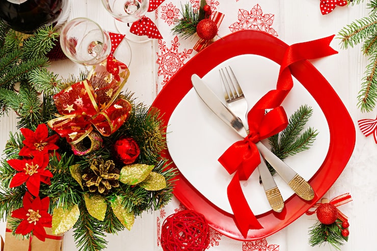 Повседневную посуду лучше убрать в шкаф. Отдайте предпочтение классическому белому сервизу или посуде с новогодним декором – оба варианта будут удачными. Главное – подготовьте тарелки и бокалы к подаче: отполируйте их до блеска с помощью бумажных полотенец, так как они эффективно впитывают влагу.