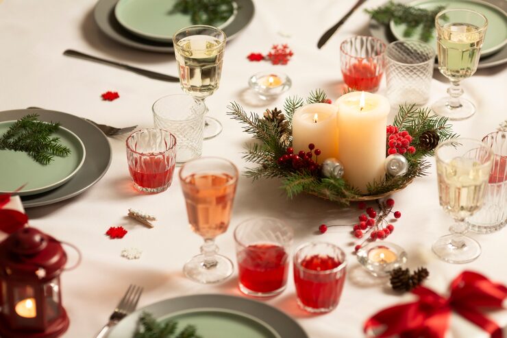 Для сервировки стола вам потребуются: скатерть, декоративная дорожка с новогодним орнаментом и тканевые салфетки для каждого приглашенного. Также рекомендуется иметь под рукой одноразовые бумажные полотенца, чтобы оперативно убрать случайные капли шампанского.