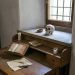 В комнате имеется комод для белья и открытые полки для декора и книг.