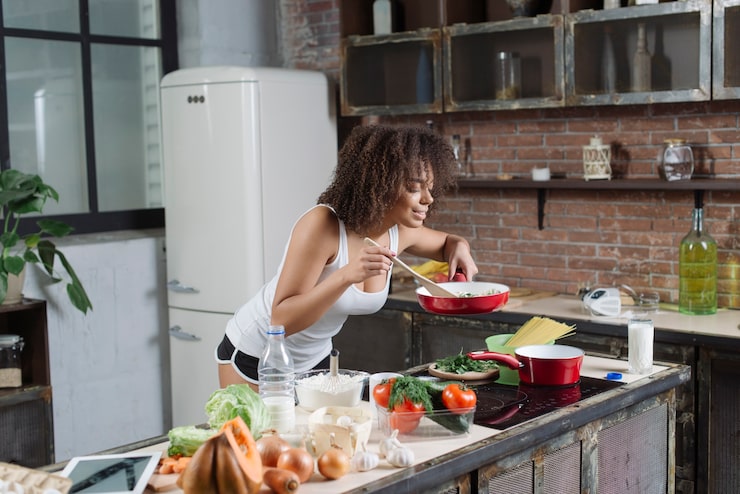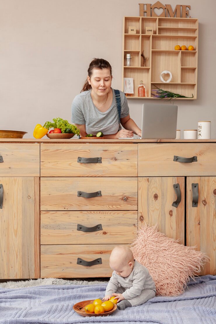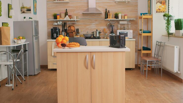 Кухонный гарнитур изготовлен на заказ, фасады покрыты пленкой, а корпуса выполнены из ЛДСП. Столешница и фартук сделаны из искусственного камня. Цвет материала идентичен цвету стен в гостиной. Он выглядит привлекательно, удобен в эксплуатации, приятен на ощупь и создает атмосферу тепла и уюта.