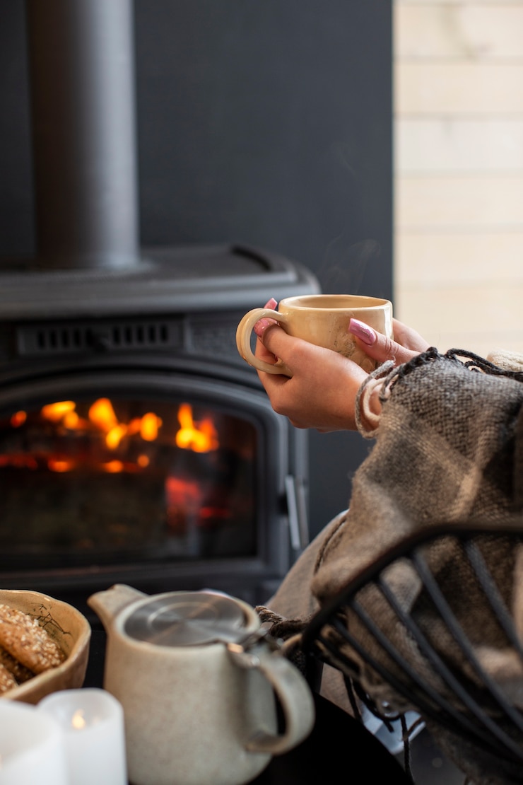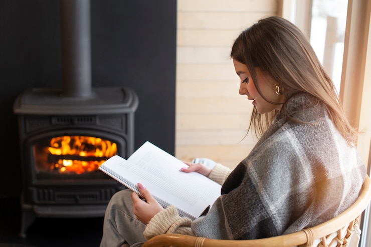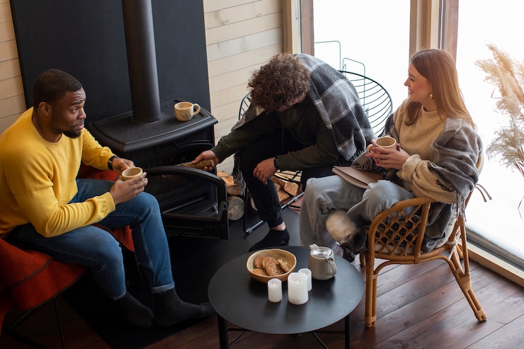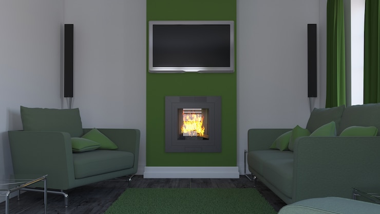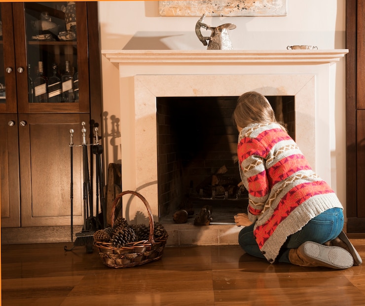 Интерьер украсят несколькими картинами в чёрных рамках и композицией из дров в нише у камина. Планируется использовать большое количество текстильных покрытий: шторы, декоративные подушкиКовры привносят ощущение уюта в дом.