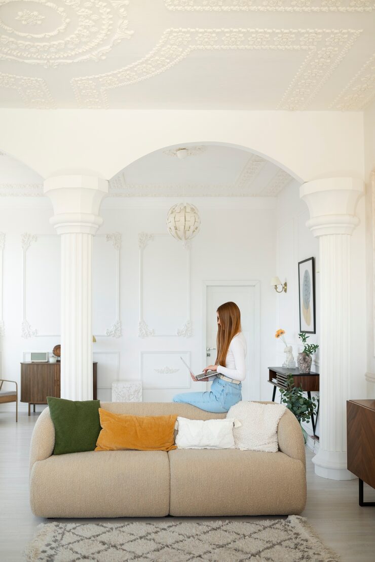 Для декорирования несущей балки на потолке и зонирования пространства, включающего гостиную и кухню, потребовалось разделить потолочную поверхность на две части.