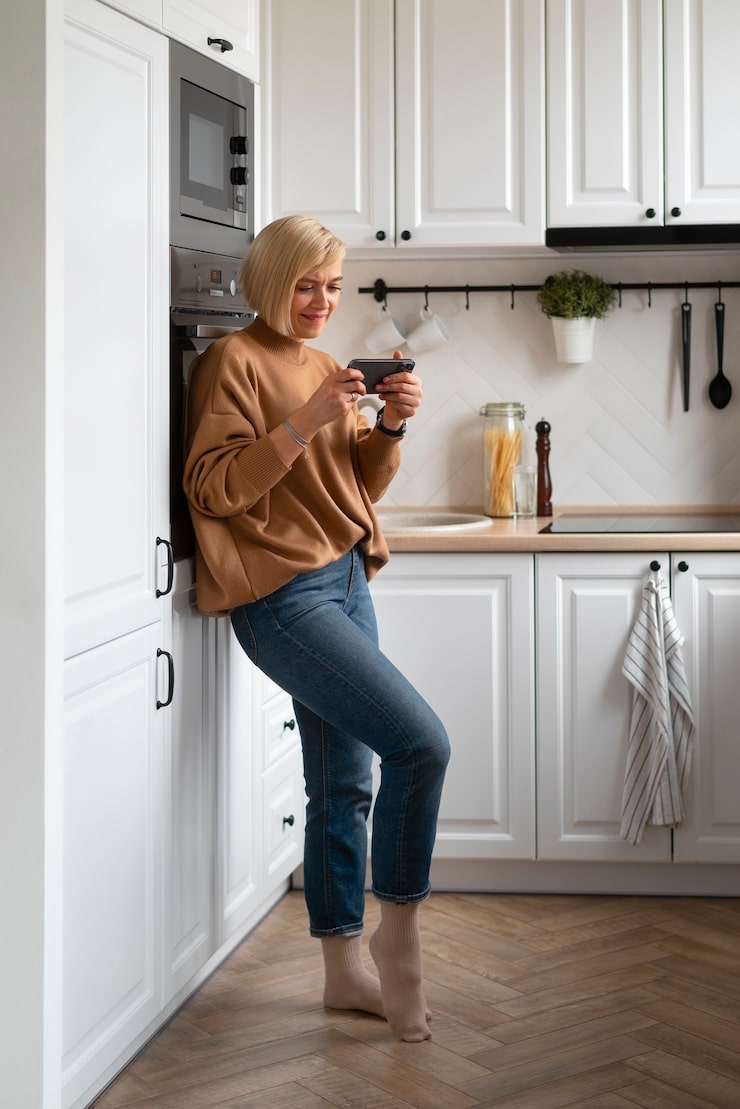 Для облицовки фартука была выбрана традиционная квадратная белая плитка. Однако, чтобы избежать монотонности в интерьере, ее дополнили контрастной затиркой. В результате получился экономичный, но при этом функциональный вариант.
