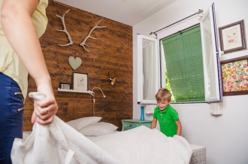 Спальное место для ребенка разместили немного выше и закрыли его рулонными шторами. В прихожей поставили вместительный встроенный шкаф для основного хранения вещей.
