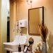 При оформлении поверхностей применяли сочетание двух видов керамогранита и краски. Акцентная стена, расположенная за раковиной, выделена черной плиткой с золотистыми прожилками. Черный цвет выбрали и для тумбы. Светлая плитка, имитирующая мрамор, использована на полу и в зоне ванны. Золотистая сантехника и освещение придали интерьеру элегантность и роскошь.