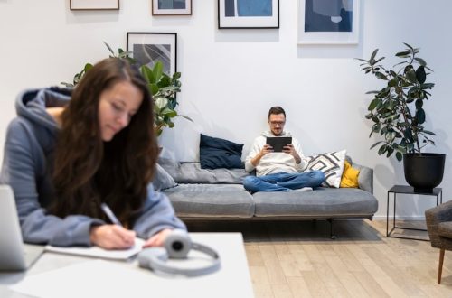 В квартире множество систем хранения: выбрали готовые, доступные по цене, но при этом привлекательные варианты. Шкаф, стеллаж, тумбы под телевизор и рабочий стол белого цвета смотрятся просто, свежо и не утяжеляют помещение.