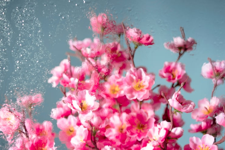 Sakura branchФотообои с крупным цветочным рисунком на флизелиновой основе, выполненные в сине-зеленой цветовой гамме, имеют гладкую поверхность, являются экологичными и бесшовными