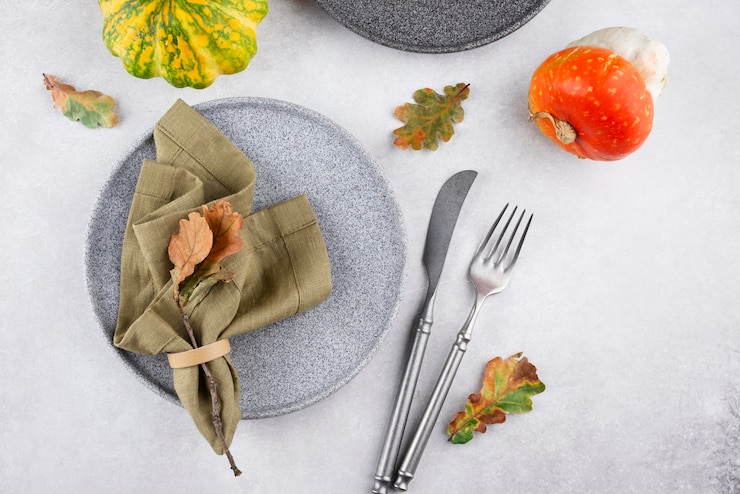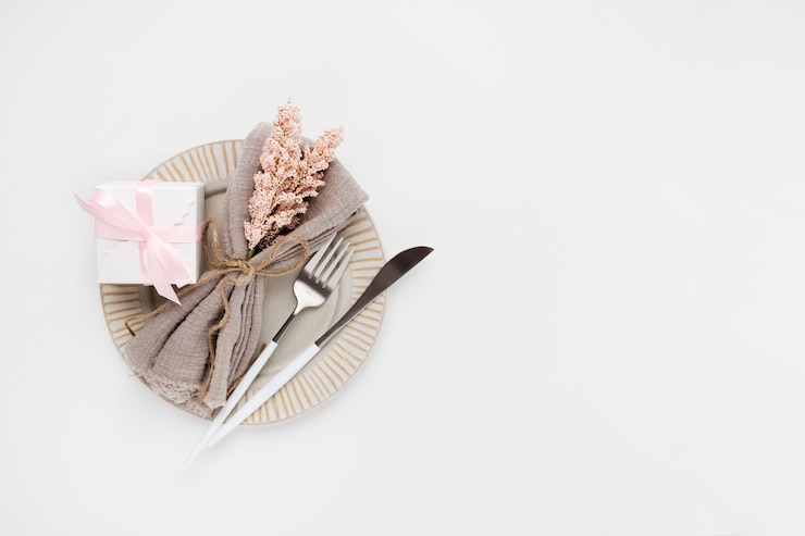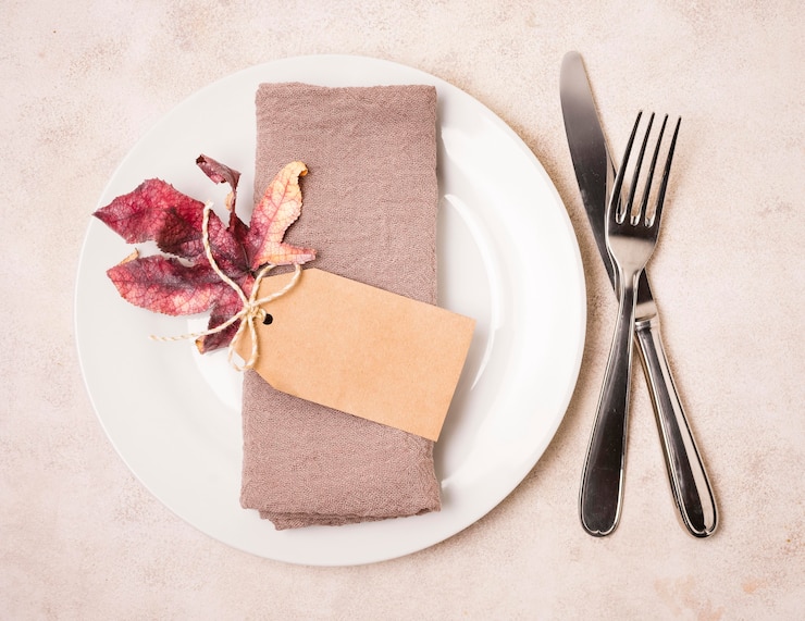 Бумажные салфетки размещают слева от тарелки, складывая угол в виде конверта или по-другому, например, создавая карман для столовых приборов. Это украшает и делает прием пищи более гигиеничным.