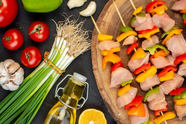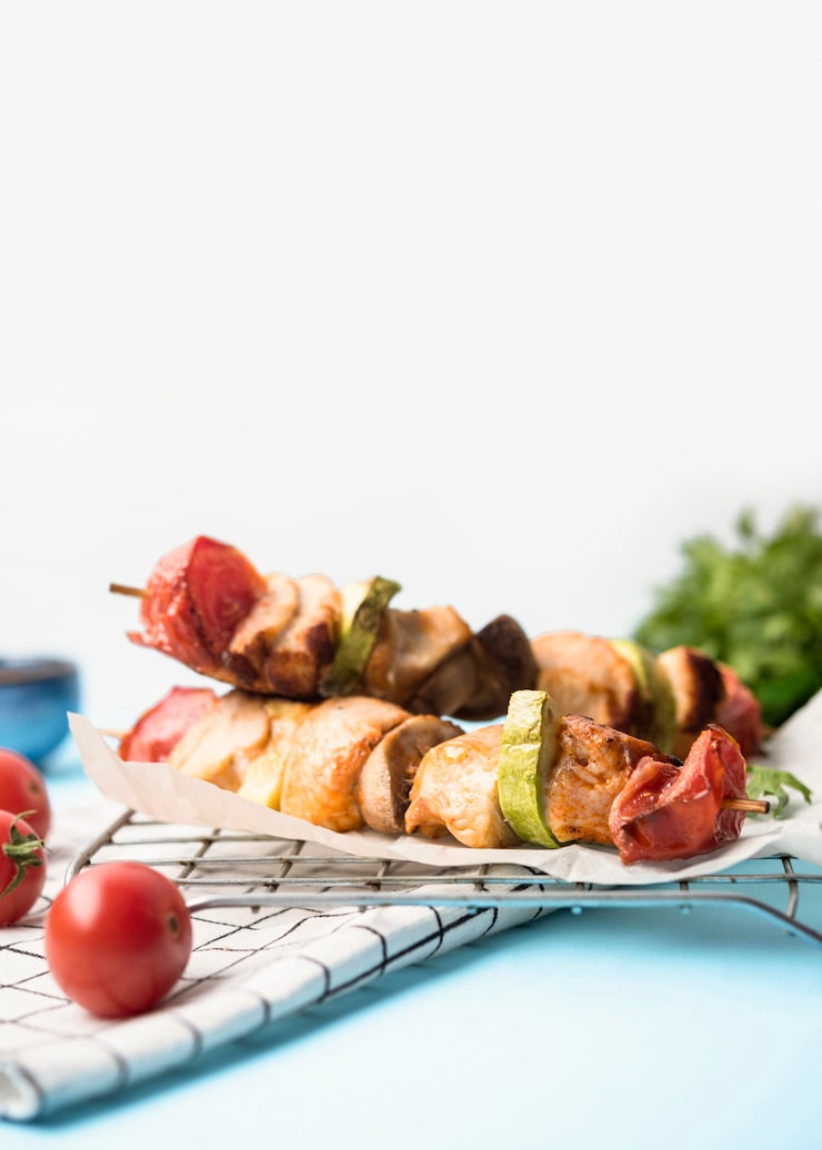 Поскольку мы готовим шашлык, можно добавить овощи-гриль. Томаты, перец, шампиньоны и кабачки особенно хороши на гриле. Их можно нанизать на шампуры между кусочками мяса, чтобы вкус получился более насыщенным.