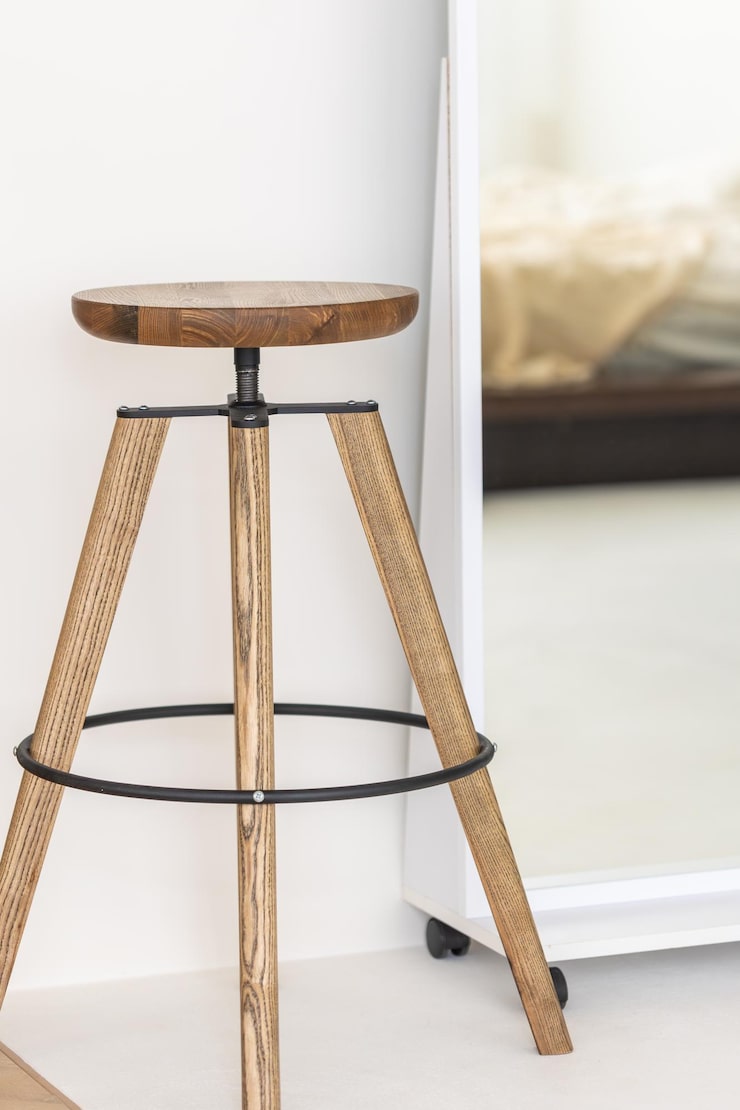 - Барные табуреты. Вместо стульев со спинками, которые занимают место даже в задвинутом положении, рекомендуется использовать барные табуреты без спинок. Такие табуреты полностью убираются под барную стойку или стол, не занимая при этом ни одного квадратного метра пола.