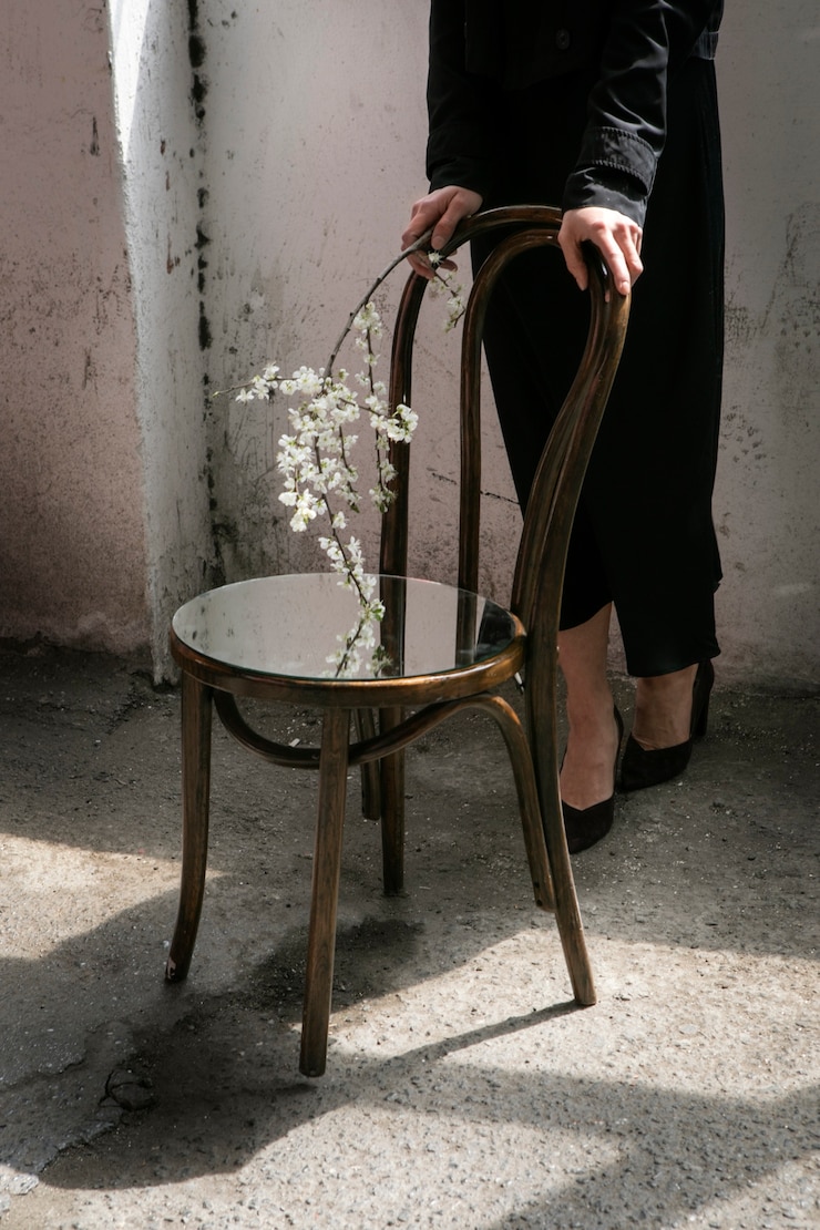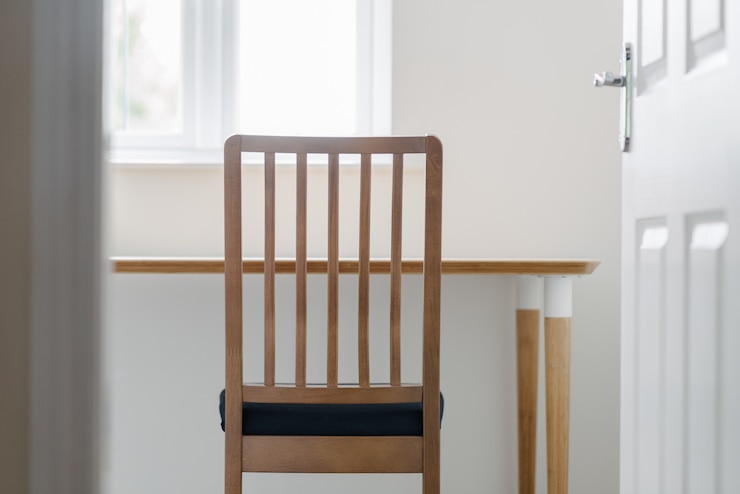 Кухня отделана в светлых тонах, но присутствуют темные акценты: коричневый обеденный стол и черные стулья из дерева. Обеденную зону разделили цветом мебели и натуральным ковром из сизаля. Полуглянцевые фасады отражают свет от мансардного окна.