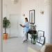В этом домашнем офисе множество любопытных деталей: необычно спроектированное кресло, письменный стол, напоминающий консоль, опирающуюся на два белого ящика для хранения. Даже вешалка и крючки для ключей и мелочей выглядят как экспонаты современного искусства.
