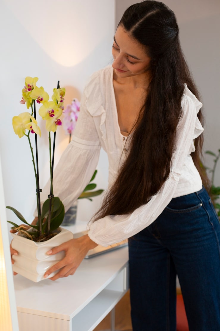 Вместо этого можно поступить иначе: добавив акценты в виде яркой орхидеи к светло-серому или бежевому фону, можно создать современный и выразительный интерьер, который будет оставаться привлекательным на протяжении многих лет, несмотря на смену тенденций.