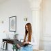 В спальне есть возможность отказаться от привычных скандинавским стилю белых стен. На нейтральном сером фоне белоснежная мебель выглядит эффектно. Природные оттенки в текстиле, забавный настенный декор и живые растения дополняют цветовую гамму комнаты. Соединение спальной зоны с рабочим мини-кабинетом рационально использует пространство. Система хранения в виде стеллажа и небольшой письменный стол не занимают много места, являясь полноценной рабочей станцией для домашнего офиса.