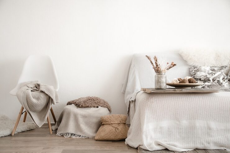 Стена за изголовьем кровати в спальне окрашена в терракотовый цвет. Этот оттенок кажется очень гармоничным и не создает резкого контраста с основным цветом стен. Кроме того, он акцентирует перспективу, которую можно увидеть из кухни-гостиной.