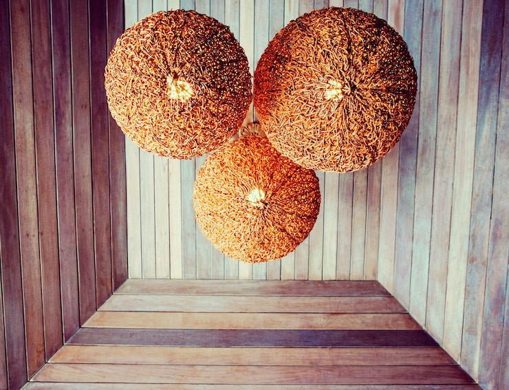 ВалуаПодвесной светильник большого размера, оснащенный тремя лампами, выполнен из металла с отделкой натуральным дубом и имеет белые льняные абажуры. Его размеры составляют 100×100×53 см