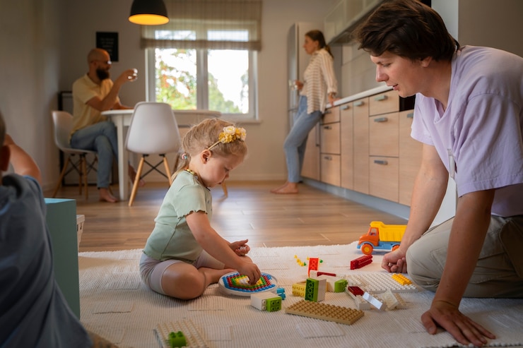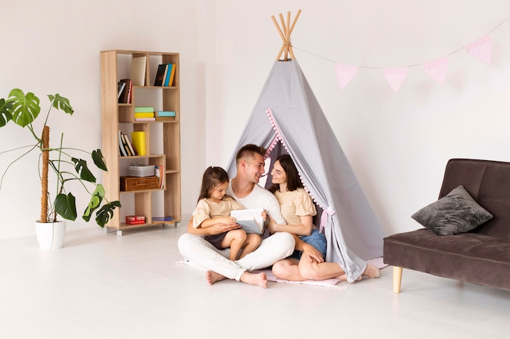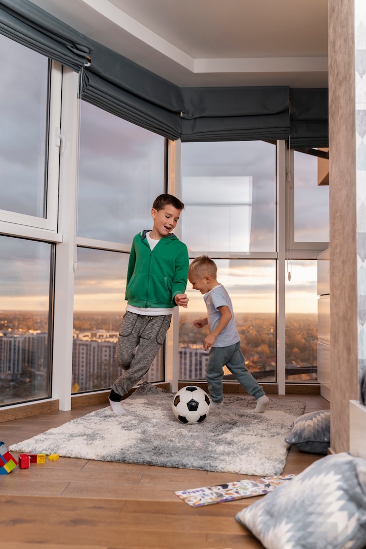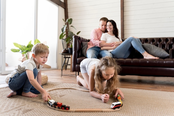 Первый этаж занимает кухня-гостиная, прихожая, гостевой санузел с функцией хозяйственной комнаты и холл первого этажа. Второй этаж устроен из трех спален, холлов — первого и второго этажей, гардеробной и двух ванных комнат. Проектировщики стремились избежать чёткого разделения зон: гостиная перетекает в холл первого этажа, по лестнице попадаем в холл второго этажа с естественным освещением, далее три спальни — две детские и главная спальня, гардеробная при главной спальне и санузел.